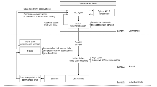 AI has been one of our bigger focus areas during this project. We developed our main AI-system as part of our AI project in the AI intro-course: The system is composed of a multilayered structure consisting of both simple reflex agents, and a machine learnt agent ordering said reflex agets around. In order to construct more complex behaviour in the reflex agents (units as we came to calling them), we introduced a middle layer where the agents behaviour is determined by states in (sub-)state machines.